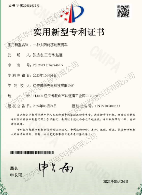 公司太阳能移动照明车产品专利申办成功